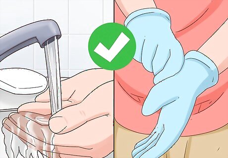 Wash your hands and wear protective gloves. Put on some protective gloves before doing any work in your aviary or with infected birds. After you finish in the aviary, take off the gloves and wash your hands and forearms.