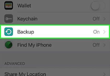 Select Backup. This is above the "Find My iPhone" option toward the bottom of the screen.