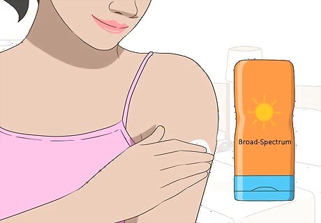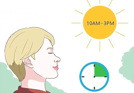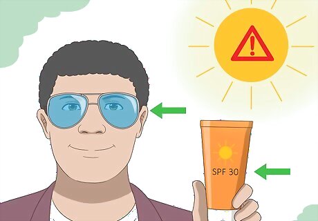 Use sunglasses and an SPF 30 sunscreen to block most UVB rays. UVB causes most sunburns, because it directly affects your very top layer of skin, and can burn you within 15 minutes. UVB are believed to cause most skin cancers, though UVA is also involved. Use sunscreen with a high SPF, or sun protection factor, which measures how much protection against UVB rays a sunscreen provides. There is no equivalent measure for protection against UVA rays. Avoid bright sunlight, especially during the brightest hours of the day, and wear sunscreen and clothing to protect your skin. Wear sunglasses on sunny days, especially if you are in a snowy area. Your hair and your clothing will also protect you from UVB rays.