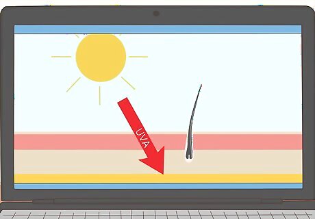 Apply broad-spectrum sunscreen to protect yourself from UVA rays. Broad-spectrum (also called full-spectrum) sunscreen blocks both UVA and UVB rays. Get in the habit of applying sunblock 20 minutes before you leave the house or sit by a window. Apply at least a shot glass to your whole body when sunbathing. Because it doesn't cause sunburns, you probably won't notice if you're getting too much UVA. Wear sunscreen indoors and on cloudy days. Wear sunscreen even when it's cloudy. UVA rays penetrate clouds. Avoid long exposure during peak hours (typically 10am-2pm). UVA rays go right through glass. Draw the shades or apply sunscreen before you sit in the window. Exposure to sunlight lightens the hair. You should protect your hair from sun exposure. It can open the cuticle, oxidize and break down the hair shaft.