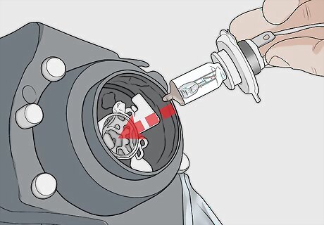 Insert the new, brighter bulb and wipe it off with an alcohol swab. Press the new bulb into the headlight bulb housing. The oil on your fingers is bad for the bulb itself, so use an alcohol swab or a bit of rubbing alcohol on a rag to wipe off the bulb once it’s in place. Leaving your skin’s oil on the bulb may cause it to blow out prematurely. You can avoid wiping off the bulb with alcohol by wearing gloves as you install the new bulb.