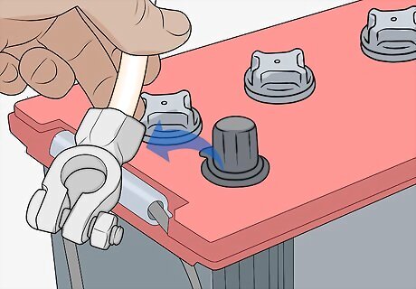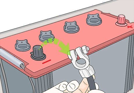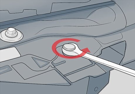 Remove the cable from the negative terminal on the battery. Use a socket and ratchet or open-ended wrench to loosen the bolt holding the negative cable on the terminal of the battery that is labeled with a negative (-) symbol. If you can’t locate your battery, your owner’s manual or manufacturer’s website can guide you. Tuck the cable to the side of the battery to keep it from coming into contact with the terminal while you work.
