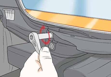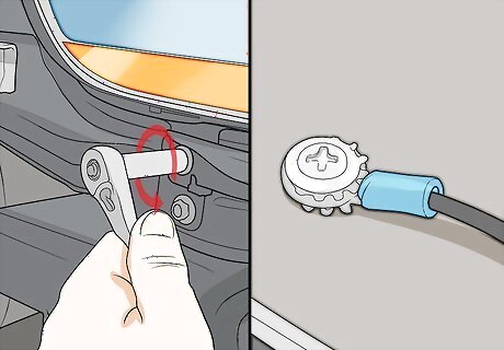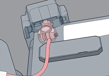 Disconnect the battery by removing the cable on the negative terminal. Locate the battery in your engine bay or the trunk of the vehicle. It will look like a black or grey rectangular box with two posts sticking out of it. Find the post for the negative terminal, which is marked with a minus (-) sign and loosen the bolt on the terminal with the correct sized wrench or socket. Then slide the cable off of the terminal. If you can’t locate your battery, refer to the vehicle’s owner’s manual or manufacturer’s website. Tuck the cable to the side of the battery so it can’t come into contact with the battery terminal while you work.