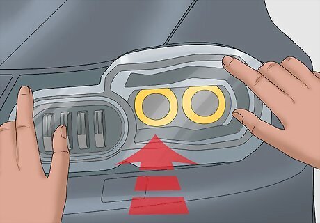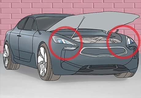 Locate the headlight assembly in the engine bay. The headlights are located at the very front of the vehicle on either side. The assemblies are the plastic headlight-shaped containers that the headlight bulb housings sit in. If you need to remove any dust or engine covers to gain access to the headlight assemblies, remove them now.