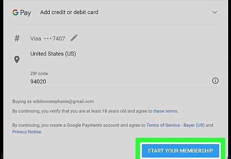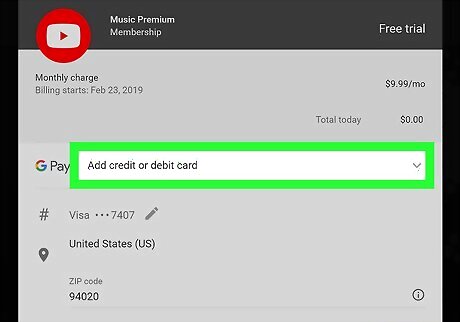 Select your payment method. In order to sign up for YouTube Music Premium, you need to have a valid credit or debit card, or PayPal on record. If you already have one associated with your account, select it from the list of payment methods. If you do not have a payment method associated with your account, select one of the following options. Select Add credit or debit card. This option allows you to enter a credit or debit card number, expiration date, CVC number, and zip code Select Add PayPal. This option allows you to provide the email address and password associated with a PayPal account.