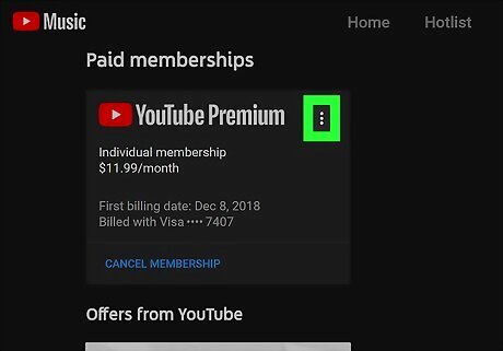Click the menu ⋮ button. The Menu button is the button with three vertical dots. It's in the upper-right corner of the YouTube Music box. It's the first box below "Paid Subscriptions" on the website. This displays a pop-up menu next to the menu button.
