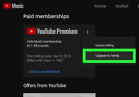 Click Upgrade to family. It's the second option in the pop-up menu. YouTube Music Premium Family allows you to add Premium for up to 6 accounts. It costs an additional $5 a month, which will be charged immediately.