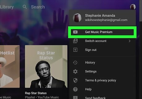 Click Get Music Premium. It's the first option in the Account menu. It's next to the grey YouTube logo.