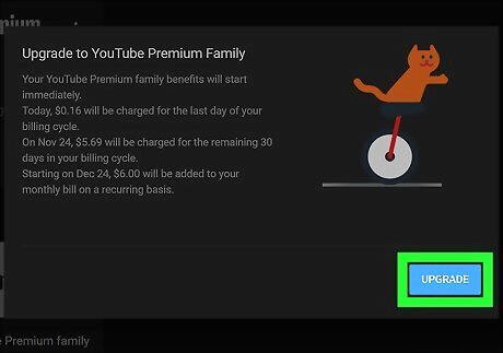 Click Upgrade. It's the blue button in the lower-right corner of the "Upgrade to YouTube Music Premium Family" window that appears in the center of the website. This charges your payment method and upgrades your account to YouTube Music Premium Family.