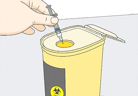 Throw the syringe into a sharps container when you're done. A sharps container is best, because these are designed to hold used needles and are properly marked. This way, no one will get pricked by the needle while it's in the trash. If you don't have a sharps container, you can also use a plastic bottle or detergent container. Make sure you write "Used Needles" on it clearly so trash collectors know to be careful
