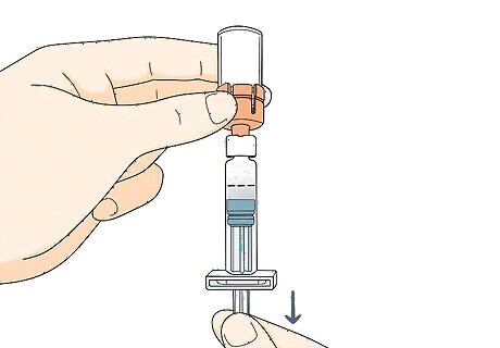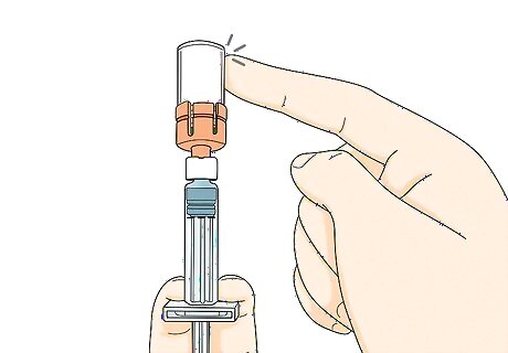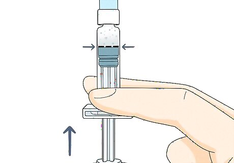 Hold the vial upside down and tap it. Keep your thumb pressing down on the plunger. Then flip the syringe upside down so the vial is on the top. Tap the vial gently with your other hand to get all of the medicine out of it and into the syringe.