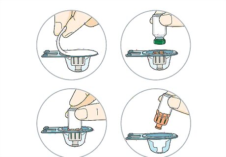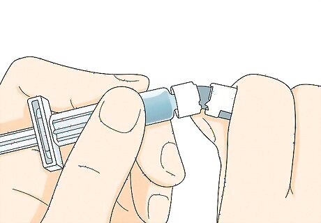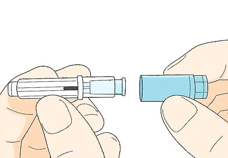 Twist the blue cap off the needle. Hold the needle firmly at the base. Using your other hand, twist the blue cap counterclockwise until it comes off. Set the needle aside in a safe spot while you work on the rest of the injection. The needle will have a cover under the blue cap that stays in place until you're ready to inject the medicine.