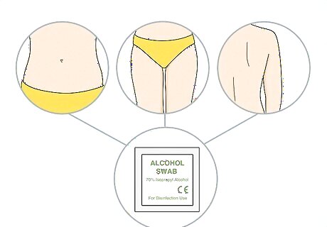 Choose and disinfect your stomach, thigh, or back of the upper arm for the injection. Any of these injection sites will work, and there's no difference between them. Pick the spot that's easiest for you to reach or the one you're most comfortable with. Whichever spot you choose, disinfect it with an alcohol swab before giving yourself the shot. You can use the same spot for all of your weekly injections if you prefer it over the others. Just try not to insert the needle in the exact same injection site. It's also fine to switch off between injection sites from week to week if you want to.