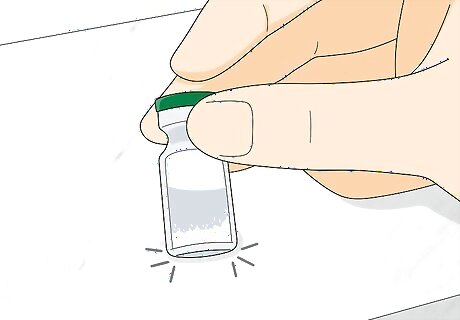 Tap the vial against a hard surface to break up clumps. The vial contains powder that needs to be mixed with the liquid in the syringe. Tap the vial gently against a hard surface to loosen the powder. Then use your thumb to pop off the green cap. Remember to keep your injection sterile. It's best to wipe your thumb with an alcohol wipe before removing the green cap.