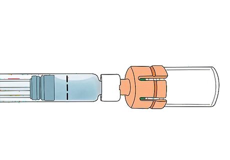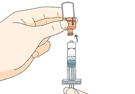 Twist the vial and connector onto the syringe. Pick up the vial, which now has the orange connector on the top of it. Place the tip of the connector into the bottom of the syringe. Hold the connector and twist it clockwise onto the syringe until it feels snug. Stop twisting as soon as the connector feels snug against the syringe. If you overtighten the vial, it could snap the syringe.