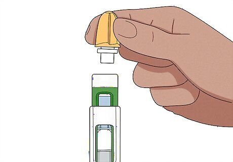 Unscrew the orange cap from the front of the pen. Keep holding the pen straight up. Turn the orange cap on the top counterclockwise to loosen it. Keep turning until the cap comes off. The green injector tip will pop up when the cap is off. If you hear clicking, you're turning the cap the wrong way.