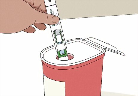 Throw the pen into a sharps container when you're done. A sharps container is best, because these are designed to hold used needles and are properly marked. This way, no one will get pricked by the needle while it's in the trash. If you don't have a sharps container, you can also use a plastic bottle or detergent container. Make sure you write "Used Needles" on it clearly so trash collectors know to be careful.