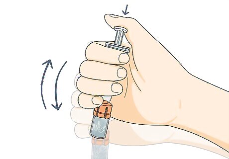 Shake the syringe and vial together to mix the medication. Push the plunger and hold it down. This joins the powder and liquid. Keep your thumb pressed down on the plunger and shake the syringe hard in an up and down motion. Continue shaking until the liquid is evenly cloudy and there are no clumps. A common recommendation is to shake about 80 times to make sure the medication is mixed all the way. If you stop shaking the syringe and still see clumps of powder on the bottom or side of the vial, shake the syringe some more. The medicine should look cloudy, but without clumps of powder, when it’s properly mixed.