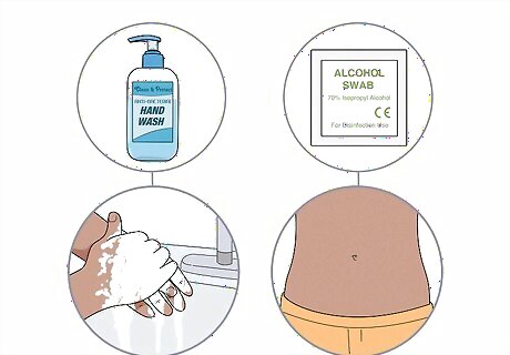 Wash your hands and the injection site before getting started. You'll be injecting a needle into your skin and you could get an infection if your hands aren't clean. Scrub your hands thoroughly with soap and warm water for at least 20 seconds before giving yourself the injection. Then clean the injection site with an alcohol swab. If you aren't near a sink or bathroom, you could also use alcohol-based hand sanitizer as a substitute.