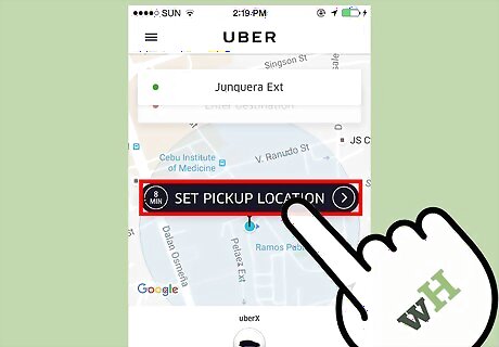 Drag and drop the pin to select a pickup location. A trip profile will display next to your payment method at the bottom of the screen. You can also set a pickup location by tapping the search bar at the top and manually entering an address.