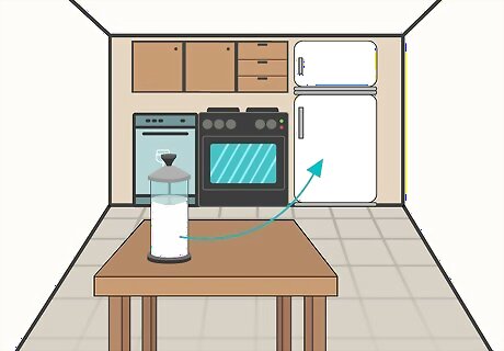 Chill your carafe of milk. Place the carafe in the refrigerator to make the milk cold. This is especially important if you buy UHT milk, which is normally unrefrigerated. Dip a spoon into the milk after 30 minutes to test the temperature on your wrist. Remove the milk from the fridge when it is cold to the touch. You can froth steamed milk, but it will make less froth. It’s best to froth the milk then heat it if you’d like your foam to be hot. There is not a particular temperature your milk needs to be chilled to.