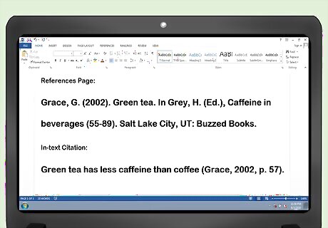 Know how to cite an essay in a book. For an essay in a book, follow this format: “Grace, G. (2002). Green tea. In Grey, H. (Ed.), Caffeine in beverages (55-89). Salt Lake City, UT: Buzzed Books.” In this instance, “Grace, G.” is the author of the essay, while “Grey, H.” is the editor of the anthology. “Green tea” is the title of the essay (no italics), and “Caffeine in beverages” is the title of the book. “55-89” is the page numbers of the essay in the book. Make an in-text citation with the author of the essay. For example “Green tea has less caffeine than coffee (Grace, 2002, p. 57).