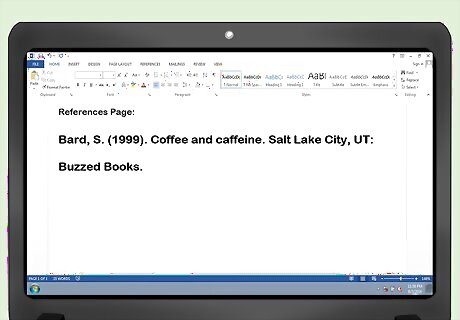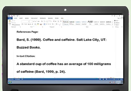 Turn the book citation into an in-text citation. To use this for an in-text citation, add a parenthesis at the end of the sentence you want to cite with the author’s late name, the publication date, and the page number you found the information on: “A standard cup of coffee has an average of 100 milligrams of caffeine (Bard, 1999, p. 24).”