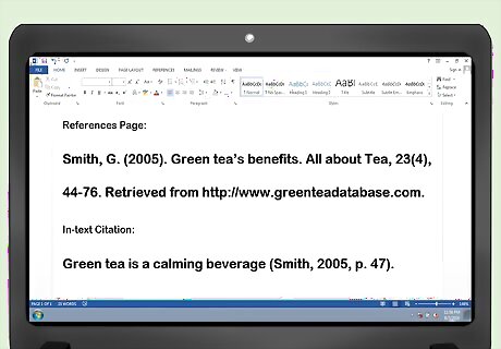 Understand how to cite journal articles. For a journal article, follow this format: “Smith, G. (2005). Green tea’s benefits. All about Tea, 23(4), 44-76. Retrieved from http://www.greenteadatabase.com.” In this case, “All about Tea” is the name of the journal, and 23(4) is the volume and issue number, while “44-76” is the page range. To make an in-text citation, use the same format: “Green tea is a calming beverage (Smith, 2005, p. 47).”