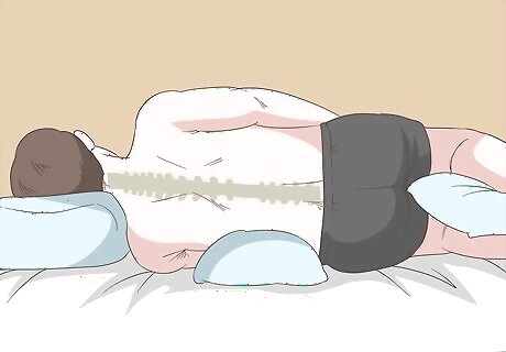 Sleep in ergonomic positions. The average worker spends about 7.7 hours asleep each day. When you spend that much time laying down, you want to make sure you are supporting your back to minimize back pain. Your bed should support your back. Ways you can sleep are: Sleep on your side — Sleep on your side with your legs slightly curled upwards toward your chest. Place a pillow between your knees; this will help support your legs and back while you sleep. Sleep on your back — Place a pillow under your knees, while lying on your back, to help maintain the natural curvature of your back and spine. This may help alleviate minor back pain. Sleep on your stomach — This position may be hard on your back. However, if you cannot sleep any other way, help support your back by placing a pillow under your pelvis or hips.
