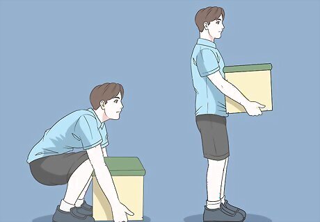 Learn to lift properly. A back brace is of little use if worn without using proper body mechanics. You should learn to squat while lifting, mainly using the force of your legs and thighs to lift the object, rather than your back. Before lifting, assess the object to see if you should ask for help with lifting. Do not try to lift something that is likely too heavy for you. Bend at the knees and squat, getting as close to the object as possible. Tighten your stomach muscles and hug the object close to your upper body. Lift with the force of your thigh muscles. Do an opposite motion when you lay the object back down.