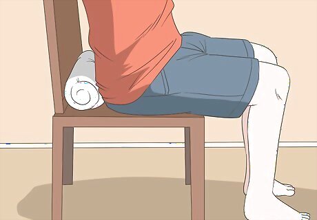 Sit in ways to support your back. The Cleveland Clinic suggests that you should sit as little as possible to reduce stress on your back. However, if you have a job that you are required to sit all day, this might not be possible. Even so, you should get up and walk around for a few minutes every hour. In addition, there are a few actions you can take to help you sit in a more supportive way. Use a rolled up towel and put it between your lower back and the chair. This will help support your lower back and force your back into a more natural position while you sit. Sit with your legs and feet at a right angle (perpendicular to the floor). Try to avoid crossing your legs or feet. This can put stress on your back and lower your blood flow in your lower extremities. If your chair is too high, use a footrest to help you achieve the perpendicular position of your legs.