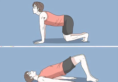 Strengthen your core muscles to support your back. You can use exercise to teach your body how to create its own "back brace," performing core exercises that stabilize the spine. There are several exercises you can perform that will help keep you core strong and your back braced for lifting. Try cat curls. Start on your hands and knees. Round your spine, tightening your abdominal muscles and allowing your head to drop. Hold for five seconds, then return to neutral. Then arch your back slightly, lifting your head (but not throwing it back). Hold for five seconds, then return to neutral. To do a bridge, lie on your back with your knees bent, feet shoulder-width apart. Your arms should be at your side, you back in a neutral position. Tighten your abs and push yourself up from the floor, lifting your hips and butt until your knees, hips, and shoulders are all in line. Hold for five seconds, then slowly release.