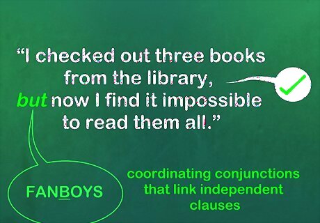 Use commas before coordinating conjunctions that link independent clauses. An independent clause is part of a sentence that has its own subject and verb. It can stand on its own as a sentence. You should always use a comma when a FANBOYS conjunction connects two independent clauses. Here is an example of a FANBOYS conjunction connecting two independent clauses: “I checked out three books from the library, but now I find it impossible to read them all.” If you removed the conjunction, each clause would stand as its own sentence. This conjunction does not connect two independent clauses: “Bai discovered he had everything he needed but a pencil.” The last part of the sentence cannot stand on its own.