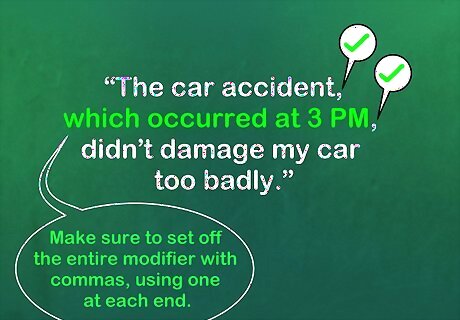 Use commas with non-restrictive modifiers. In almost all cases, non-restrictive clauses or phrases will be set off on both sides by commas. This indicates to the reader that they’re additional information, but not necessarily essential. If you can remove the clause without damaging the sense of your sentence, it is almost certainly a non-restrictive modifier. Make sure to set off the entire modifier with commas, using one at each end. A common comma error is to set off the beginning of the modifier with a comma, but not the end. In almost all cases, relative clauses or phrases beginning with which will be non-restrictive modifiers and should be set off with commas: “The car accident, which occurred at 3 PM, didn’t damage my car too badly.”