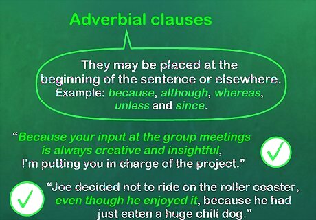 Use a comma to separate an adverb clause. Adverbial clauses begin with subordinating conjunctions, which connect the clause to the main sentence. Adverbial clauses are always dependent because of these conjunctions, and they cannot stand on their own. They may be placed at the beginning of the sentence or elsewhere. Common subordinating conjunctions include because, although, whereas, unless and since. For example, here is an adverb clause that begins a sentence: “Because your input at the group meetings is always creative and insightful, I'm putting you in charge of the project.” Here is an adverb clause later in a sentence: “Joe decided not to ride on the roller coaster, even though he enjoyed it, because he had just eaten a huge chili dog.”