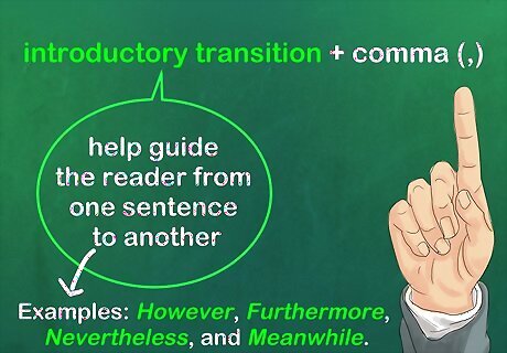 Use a comma after an introductory transition. Introductory transitions help guide the reader from one sentence to another, and they should be set off from the sentence by a comma. Common introductory transitions include However, Furthermore, Nevertheless, and Meanwhile. Introductory transitions may also take the form of phrases, such as In addition and Despite this ___. Set them apart with commas too.