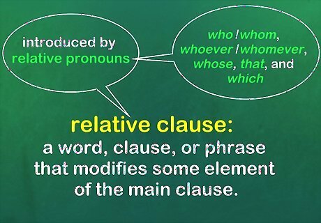 Understand what a relative clause is. A relative clause is a word, clause, or phrase that modifies some element of the main clause. Relative clauses are introduced by relative pronouns. Common relative pronouns include who/whom, whoever/whomever, whose, that, and which. In general, they come in two types: non-restrictive and restrictive.