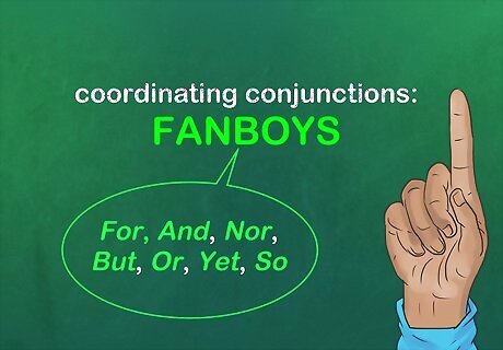 Use FANBOYS to help you remember the coordinating conjunctions. Coordinating conjunctions serve as connections within a sentence. The coordinating conjunctions in English are For, And, Nor, But, Or, Yet, So.