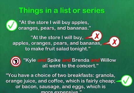 Use commas to separate things in a list or series. If you have a series of three or more items, use commas to separate each item. For example, here is a list separated by commas: “At the store I will buy apples, oranges, pears, and bananas.” Do not place commas before or after the list or series. This comma usage is incorrect, as shown in this example: “At the store I will buy, apples, oranges, pears, and bananas, to make fruit salad tonight.” Do not use commas when all the items in a series are linked by and, or, or nor. For example, here is a list of items linked by and: “Kyle and Spike and Brenda and Willow all went to the concert.” If all of the items in your series are phrases instead of single words, or if the items in your list contain commas, it is acceptable to use semicolons to separate the items instead of commas: “You have a choice of two breakfasts: granola, orange juice, and coffee, which is fairly cheap; or bacon, sausage, and eggs, which is more expensive.”