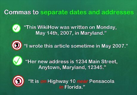 Use a comma to separate dates and addresses. Each of the elements in a date (weekday, month and day, and year) should be separated by a comma. Also use a comma to separate the elements in an address, or when referring to a city and state or country. For example, you would use a comma in this sentence: “I love to visit Tokyo, Japan.” Here is an example of correct comma usage for a date: “This WikiHow was written on Monday, May 14th, 2007, in Maryland.” When only the month and year appear, do NOT use a comma: “I wrote this article sometime in May 2007.” Here is an example of correct comma usage for an address: “Her new address is 1234 Main Street, Anytown, Maryland, 12345.” When the elements of the address are joined by a preposition, no commas are needed: “It is on Highway 10 near Pensacola in Florida.”