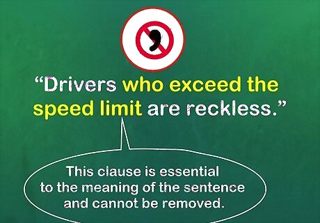 Understand how restrictive modifiers work. Restrictive modifiers are relative clauses or phrases that are crucial to the meaning of your sentence. They cannot be removed without damaging the sense of your sentence. Here is an example of a restrictive modifier in a sentence: “Drivers who exceed the speed limit are reckless.” This clause is essential to the meaning of the sentence and cannot be removed. Here is another example of a restrictive modifier: “The song named “Roar" is popular; the song named “Latte Love" that I made up yesterday is not.’’ While these modifiers do offer additional information, they cannot be removed without obliterating the sentence’s meaning: “The song [??] is popular; the song [??] that I made up yesterday is not.”