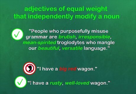 Use commas between two or more adjectives of equal weight that independently modify a noun. Here's how to know whether the adjectives are functioning independently: If you could insert the word "and" between the adjectives without changing the meaning of the sentence (or producing gibberish), they are functioning independently and a comma should separate them. For example, here is a sentence with a series of adjectives that is punctuated correctly: People who purposefully misuse grammar are brutish, irresponsible, mean-spirited troglodytes who mangle our beautiful, versatile language. Some word pairs act as a single word (disc jockey, young man). Commas are not necessary with these. Do not use a comma if the adjectives are joined by a conjunction! Do not use a comma if the adjectives are of unequal weight; for example, if one of the adjectives is a color or number and the other is a quality, you would not use a comma. For example, "I have a big red wagon" would not take commas, while "I have a rusty, well-loved wagon" would.