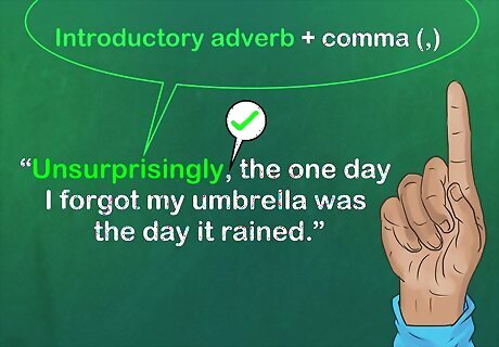 Use a comma after most introductory adverbs. Adverbs often end with the suffix -ly and modify verbs or adjectives. Adverbs are sometimes used at the beginning of sentences to explain how something happened or felt, especially in informal writing. Common examples include generally, usually, and fortunately. For example, here is a sentence that begins with an introductory adverb: “Unsurprisingly, the one day I forgot my umbrella was the day it rained.” Adverbs such as when and while usually introduce a restrictive modifier and should usually not be set off by commas. Commas should be used to offset introductory adverbs that modify the entire sentence, not ones that modify a single element of the sentence (such as the verb).