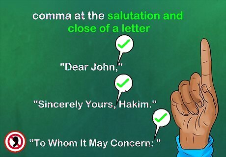 Use a comma at the salutation and close of a letter. The salutation is the greeting at the beginning of a letter, such as "Dear John." The closing greeting should also be set off with a comma: "Sincerely yours, Hakim." When writing business letters, it is customary to use a colon rather than a comma: "To Whom It May Concern: [body of letter]"