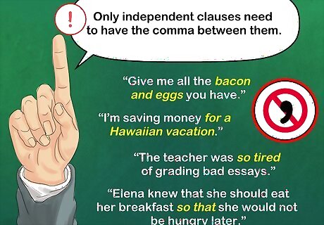 Pay attention to the grammar of the sentence. The presence of a conjunction does not necessarily require a comma. Only independent clauses need to have the comma between them. For example, if your sentence joins only two words with a conjunction, do not use a comma: “Give me all the bacon and eggs you have.” If your sentence uses “for” as a preposition to join a dependent clause, do not use a comma: “I’m saving money for a Hawaiian vacation.” If your sentence uses “so” to emphasize another word, do not use a comma: “The teacher was so tired of grading bad essays.” If your sentence uses “so” in the phrase “so that,” do not use a comma: “Elena knew that she should eat her breakfast so that she would not be hungry later.”