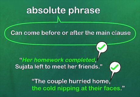 Use a comma to separate an absolute phrase. An absolute phrase, also called a nominative absolute, modifies the entire sentence. While they usually come before the rest of the sentence, they may also come after the main clause. An absolute phrase usually has its own subject and is generally formed with a "noun" and a "participle" (an "-ing" or "-ed" word). Here is an example of an absolute phrase beginning a sentence: “Her homework completed, Sujata left to meet her friends.” Here is an example of an absolute phrase concluding a sentence: “The couple hurried home, the cold nipping at their faces.” This phrase modifies the entire main clause before it.