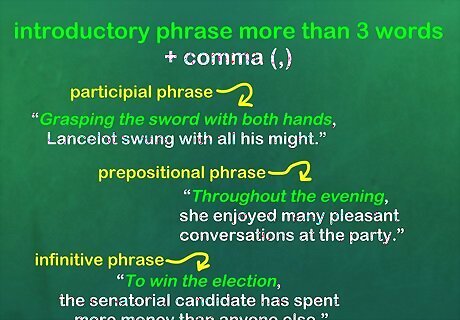 Use a comma after an introductory phrase more than 3 words. These phrases add information to a sentence, but do not have a subject and verb that are separate from the subject and verb in the main clause of the sentence. If the introduction is less than 3 words, a comma is considered optional. Common introductory phrases include participial phrases (phrases that function as adjectives to describe something in the main clause), prepositional phrases, and infinitive phrases (beginning with infinitive verbs [to eat, to listen, etc.]). For example, this is a participial phrase: “Grasping the sword with both hands, Lancelot swung with all his might.” Grasping the sword with both hands modifies Lancelot, the subject of the main sentence. This is an example of a prepositional phrase: “Throughout the evening, she enjoyed many pleasant conversations at the party.” Here is an example of an infinitive phrase beginning a sentence: “To win the election, the senatorial candidate has spent more money than anyone else.” Don't mistake gerunds (verbal nouns with -ing endings) for an introductory participial phrase. For example, you would not use a comma in this sentence: “Writing with perfect grammar is difficult but achievable.” The gerund phrase Writing with perfect grammar is the subject of the sentence.