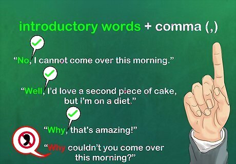 Use a comma after introductory words. One-word introductory elements include words such as no, yes, and well, and are separated by a comma from the main clause when they begin a sentence. Here is an example of an introductory word beginning a sentence: “No, I cannot come over this morning.” Here is an example of well as an introductory word: “Well, I’d love a second piece of cake, but I’m on a diet.” Why can also be used as an introductory word, but be careful: it should only be set off by a comma when it is not essential to the meaning of the sentence. The comma in the sentence “Why, that's amazing!” is correct. However, you would not use a comma in this sentence: “Why couldn’t you come over this morning?”