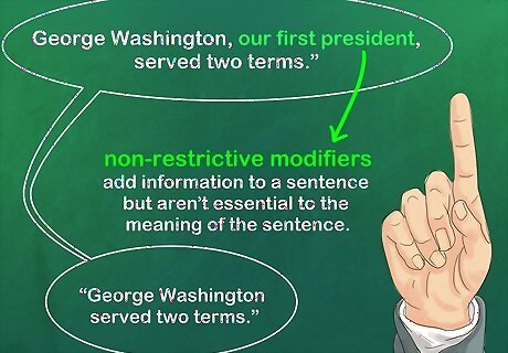 Understand how non-restrictive modifiers work. Non-restrictive modifiers are relative clauses or phrases that add information to a sentence but aren’t essential to the meaning of the sentence. If you removed a non-restrictive modifier from the sentence, it would still make sense (and the main subject of the sentence would still be in place). They are also sometimes called “interrupters.” Here is an example of a non-restrictive modifier in a sentence: “George Washington, our first president, served two terms.” While the information in the non-restrictive modifier is helpful, the main clause makes sense if it’s removed: “George Washington served two terms.” Here is another example of a non-restrictive modifier: “Fatima, who has been studying hard, will probably do well on today’s exam.” The presence of who (a relative pronoun) in a clause is often a sign that it’s non-restrictive and should be set off by commas.