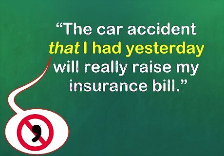 Avoid using commas with restrictive modifiers. Because they are essential to the meaning of your sentence, setting off these clauses or phrases with commas will interfere with the clarity of your sentence. In almost all cases, a clause beginning with the relative pronoun that will be restrictive and should not be set off with commas: “The car accident that I had yesterday will really raise my insurance bill.”